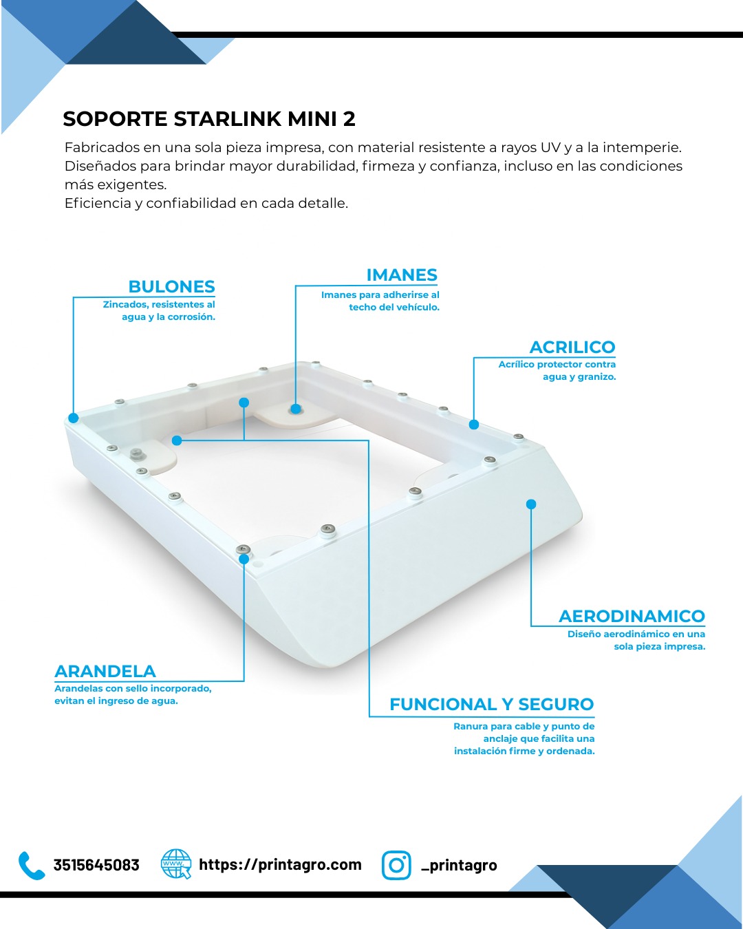 Este soporte está impreso en una sola pieza con material resistente a los rayos UV y a la intemperie. Proporciona una instalación firme, segura y aerodinámica para tu antena Starlink Mini 2, ideal tanto para uso fijo como para vehículos, campers o zonas rurales.