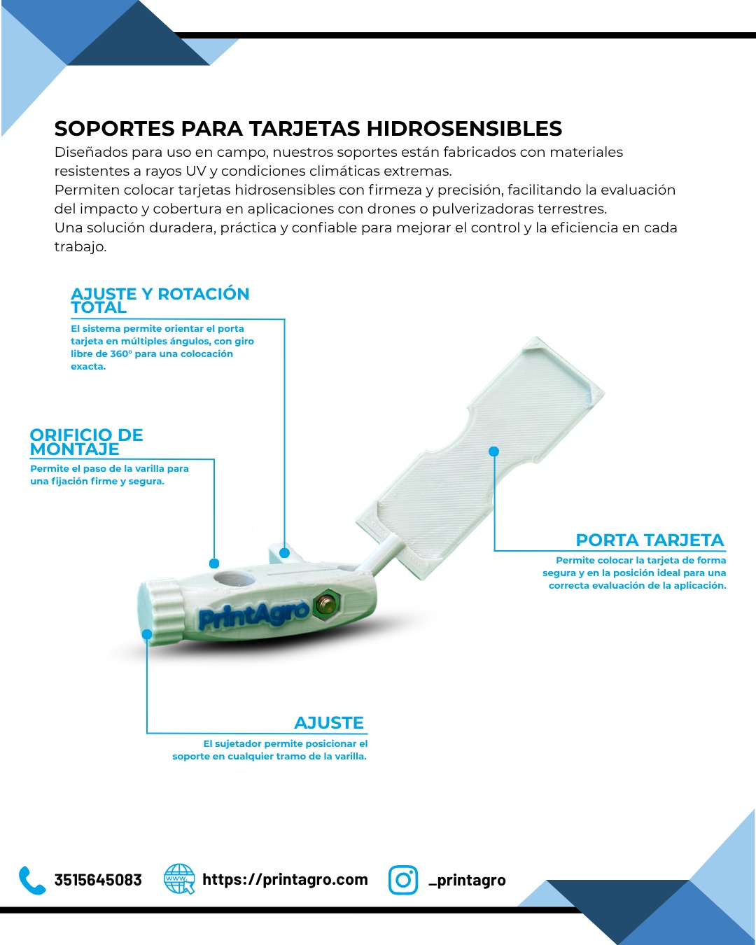 Diseñados para uso en campo, nuestros soportes están fabricados con materiales resistentes a los rayos UV y a las condiciones climáticas más exigentes. Permiten colocar tarjetas hidrosensibles con firmeza y precisión, facilitando la evaluación del impacto y la cobertura en aplicaciones con drones o pulverizadoras terrestres.